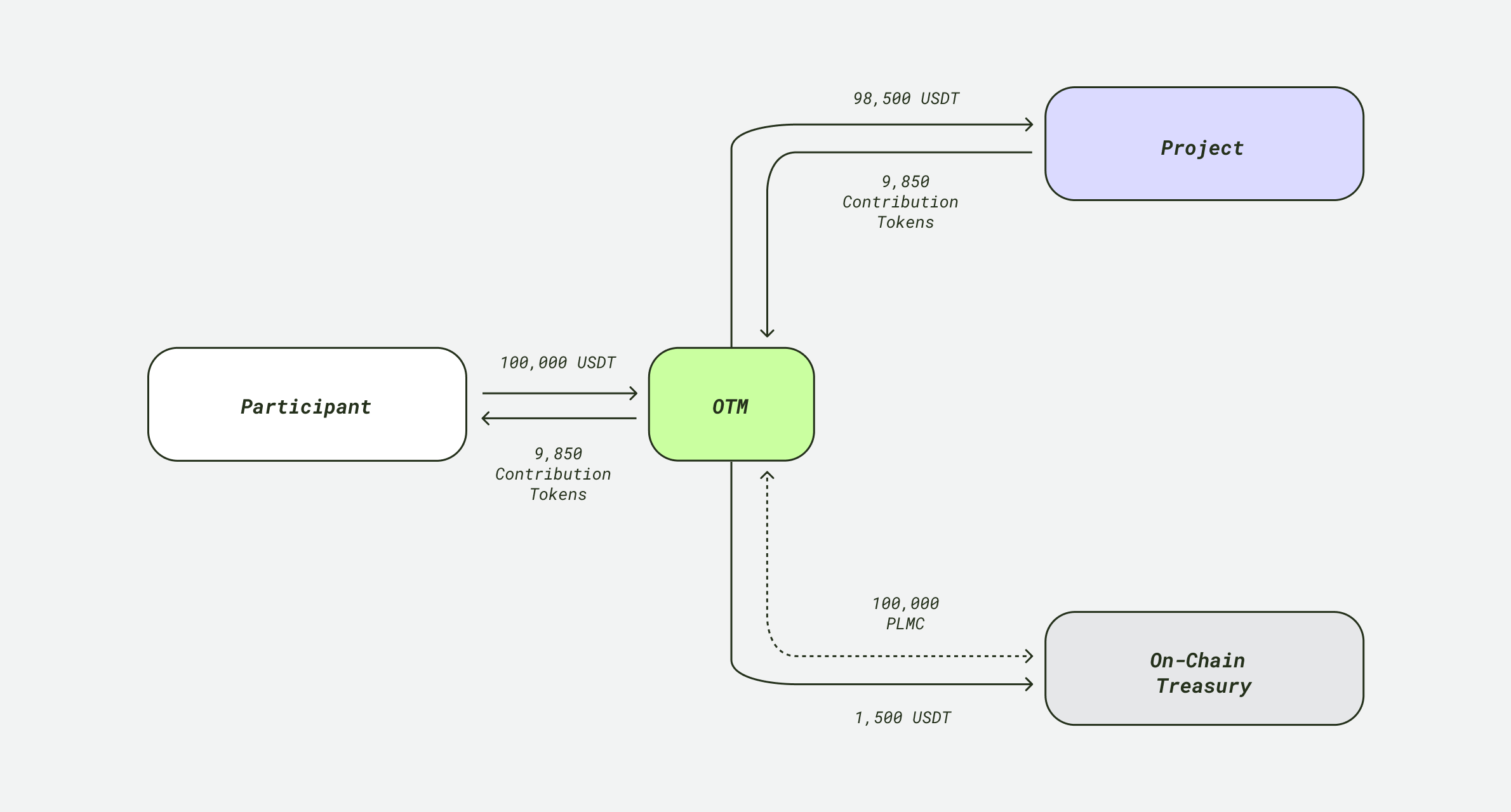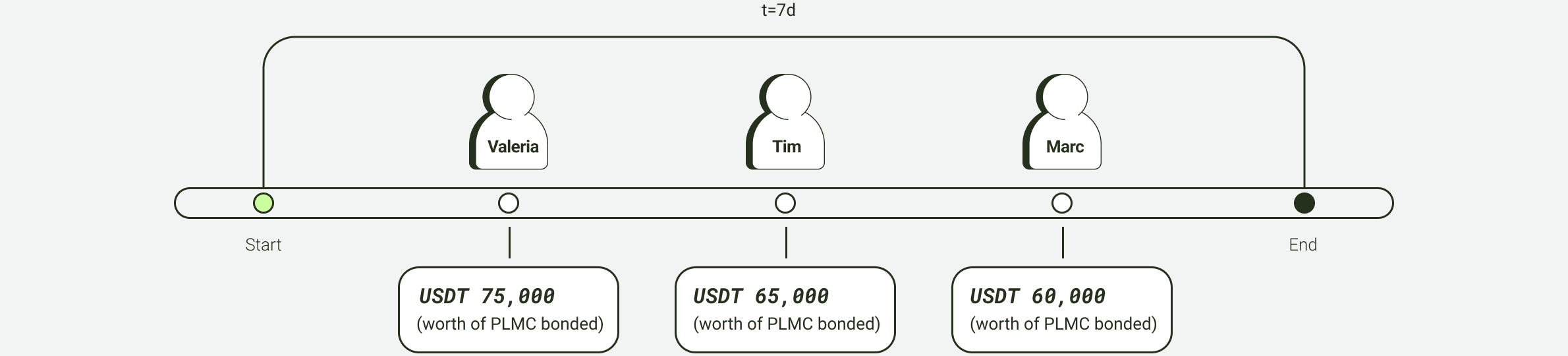 Let’s assume Sofia participates using the OTM instead of bonding PLMC. She bids for 10,000 contribution tokens at the price of USDT 10, making her total bid USDT 100,000. Since the multiplier is set at 5 – as with the OTM – she needs to bond USD 20,000 worth of PLMC. With a price of USD 0.20 per PLMC, this equates to 100,000 PLMC.