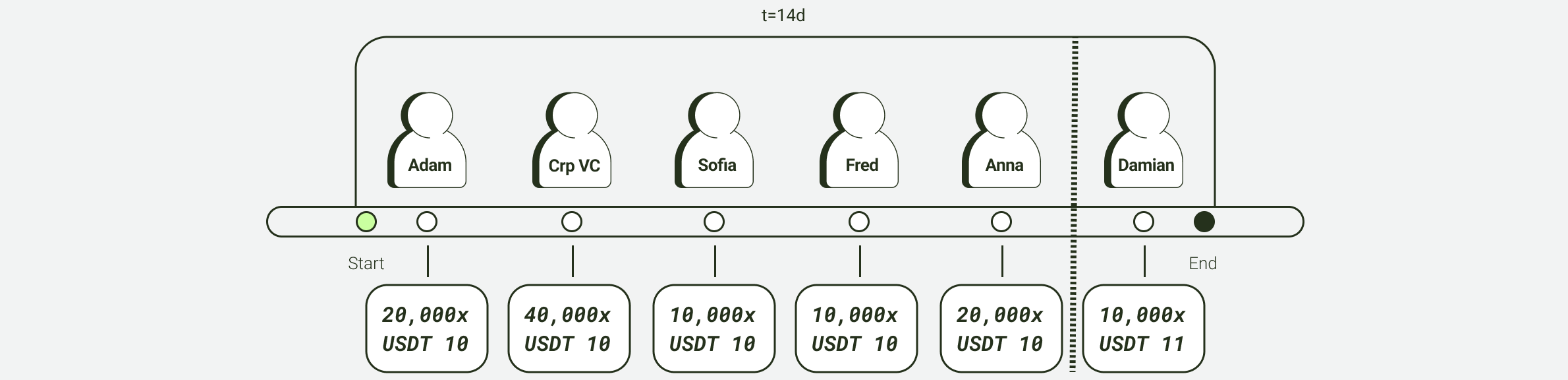 As the total amount of contribution token bids exceeded the contribution tokens allocated to the funding round, there was an adjustment in the genesis tranche. Anna’s contribution token amount was reduced to 10,000. This adjustment is due to the fact that she placed the most recent bid at the minimum price per contribution token. The difference of 10,000 contribution tokens is allocated to Damian. Damian filled the most recent tranche of 10,000 contribution tokens at USDT 11, representing the highest price.&#x20;