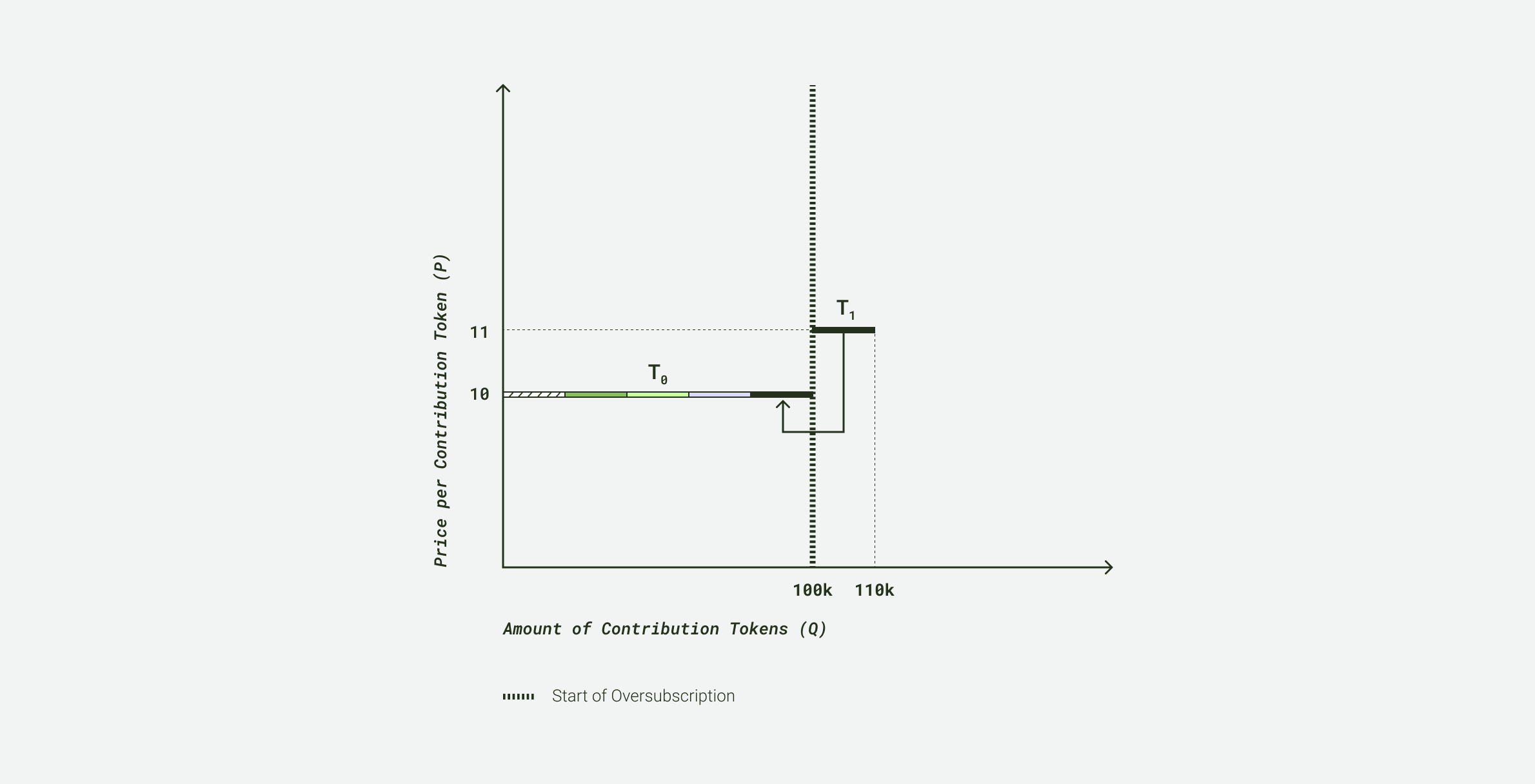 In oversubscribed rounds, the highest-ranked bids are accepted, while the lowest-ranked bids are excluded. Each tranche is allocated a fixed amount of 10% of Q₀ which, in this example, is 10,000 contribution tokens. In addition, referring to the formula above, the price development for this example unfolds as follows: